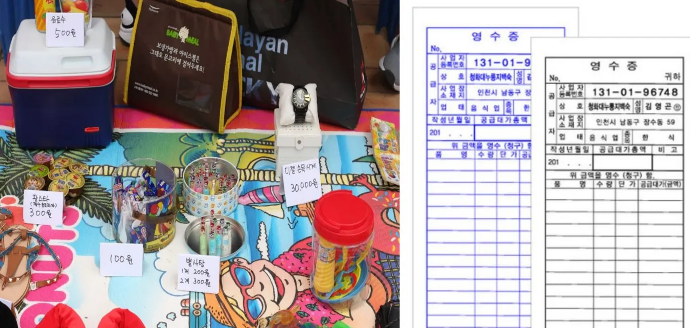 본부석에서 출석 후 사업자등록증, 장터조끼, 정산표를 받아요.