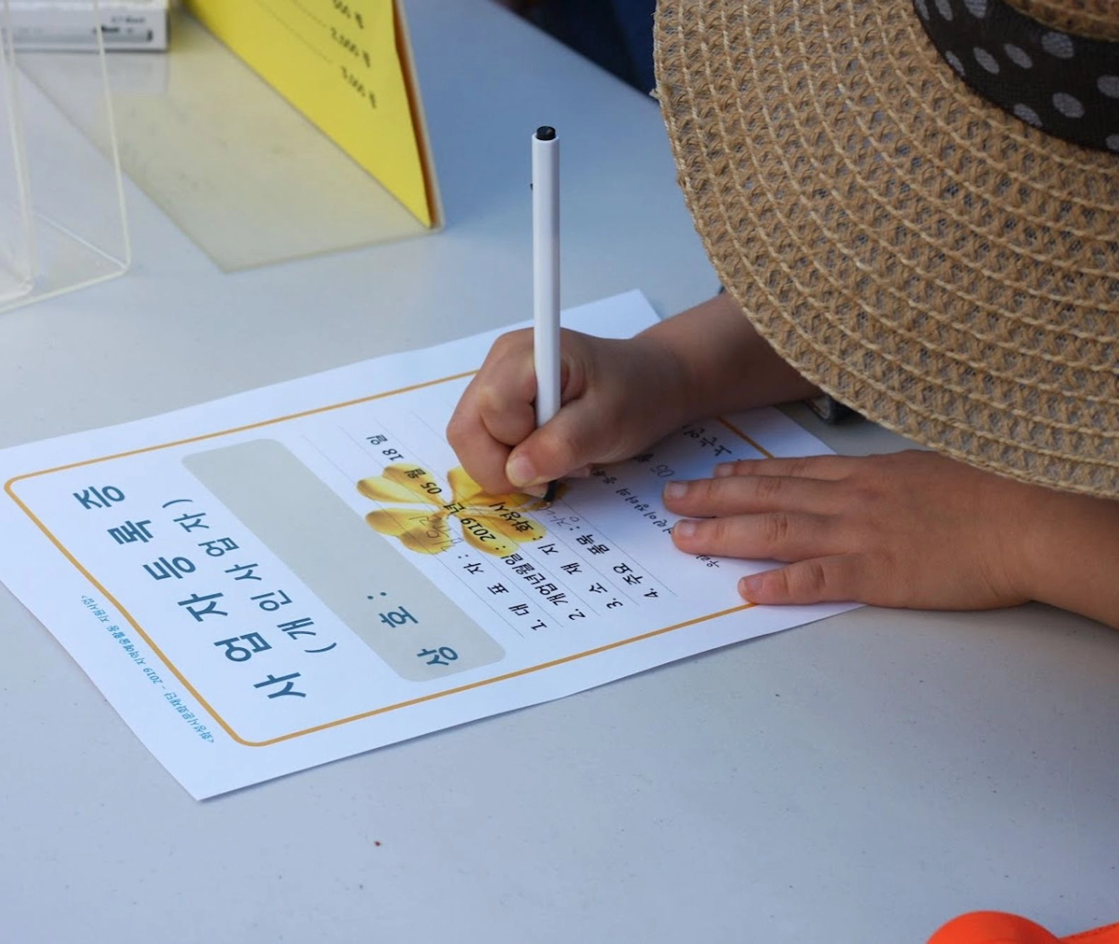 본부석에서 출석 후 사업자등록증, 장터조끼, 정산표를 받아요.