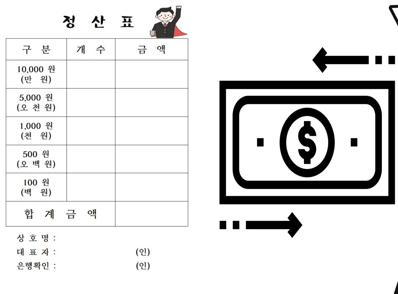 마감 후 정산표를 작성하고 은행에서 매출금(장터화폐)을 현금으로 환전해요.